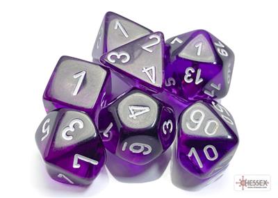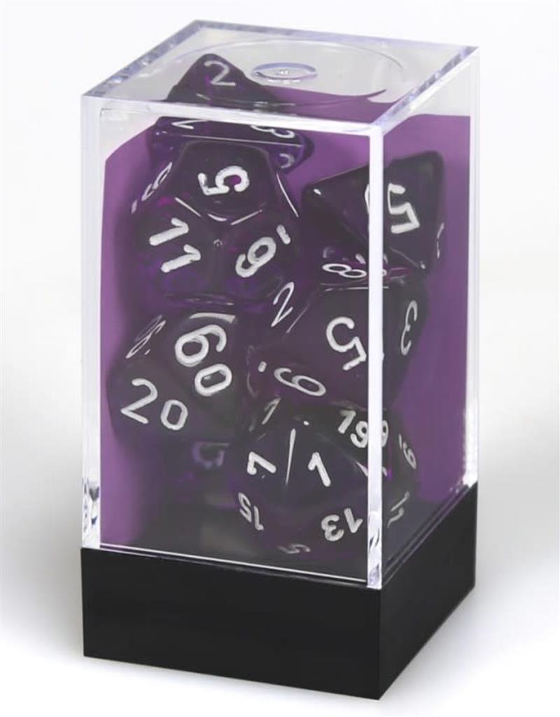 For use in tabletop RPG games (such as Dungeons & Dragons). This set contains 7 Translucent purple dice with white numbers with the following shapes: 1 x 4-sided die 1 x 6-sided die 1 x 8-sided die 1 x 10-sided die 1 x tens 10-sided die 1 x 12-sided die 1 x 20-sided die
